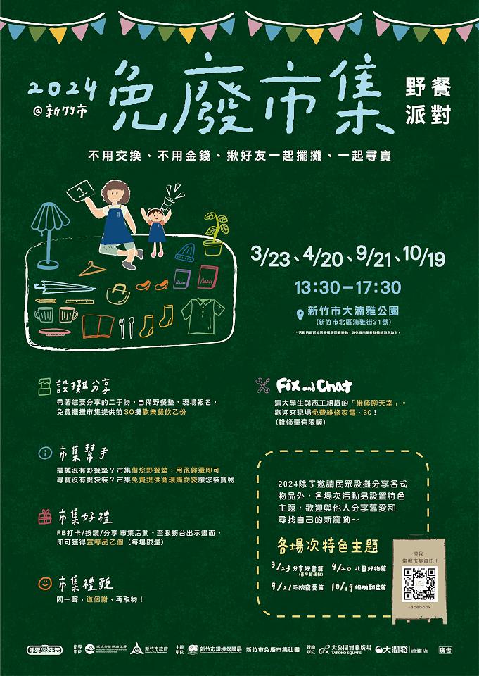 新竹市一年一度的環保盛事「免廢市集」又來囉!由新竹市環保局舉辦的「免廢市集‧野餐派對@新竹市」活動,首場活動將在3月23日13時30分於大湳雅公園開跑,以「不用交換、不用金錢」的「免費分享」的方式,將家中閒置物品又捨不得丟的物品給需要的人使用,今年免廢市集共規劃4場,邀請青年學子參與擺攤、表演節目,一起體驗快樂做環保,共同響應惜物愛地球。