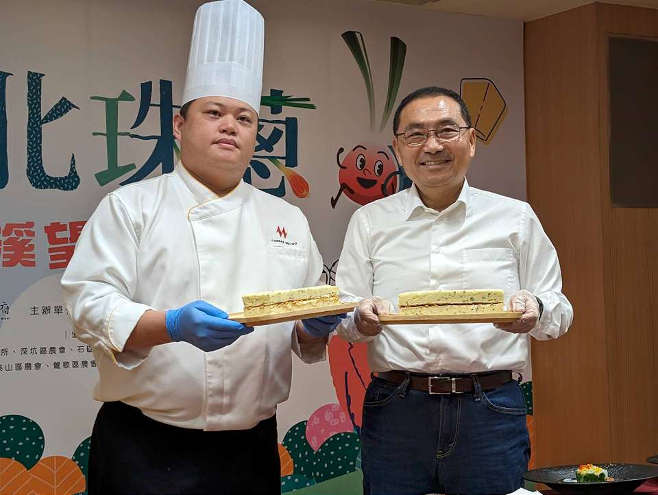 市長侯友宜大讚主廚製作的蔥香鹹蛋糕。翻攝新北市政府