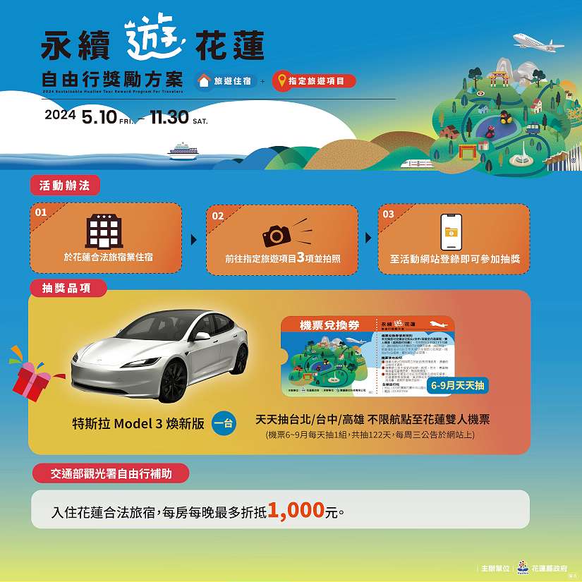 觀光處處長余明勲表示,「2024永續遊花蓮-國內自由行獎勵方案」活動持續到11月30日,只需入住花蓮合法旅宿,並前往三項指定旅遊項目合照上傳到活動官網,就有機會獲得最大獎電動汽車特斯拉Model 3 煥新版,更將至9月底天天抽出台北、台中或高雄不限航點飛花蓮的雙人單程機票。詳細方案內容請見「永續遊花蓮獎勵方案」活動網站(https://hltrip.tw)。另外交通部觀光署針對自由行推出補助方案,不分平假日住宿每人每房補助1,000元,9月1日至11月30日每月皆可使用補助1次。
