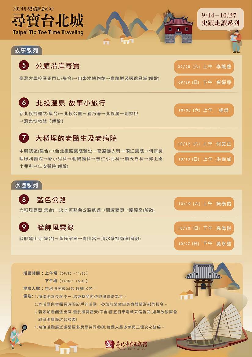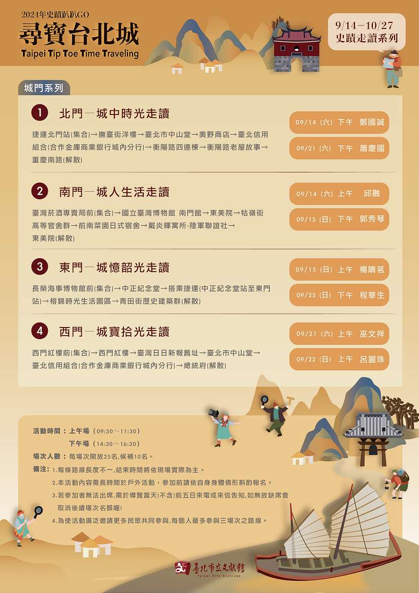 四大城門、水陸、故事系列 假日主題導覽接續登場-9月14日至10月27日,週六、日將接續舉辦四大城門、水陸故事等包含9條主題路線、16場次導覽走讀活動:「四大城門」路線,分別以東、西、南、北四大城門為起點,穿梭附近大街小巷的史蹟空間,北門路線另安排銅管重奏團演奏望春風、雨夜花等耳熟能詳的臺灣歌謠,歌頌臺北建城140週年,訴說當年流行音樂與臺北的發展脈絡;「大稻埕的老病院」路線,在大稻埕老城區中認識臺灣醫學發展的精華縮影;「藍色公路」導覽活動,將由大稻埕碼頭出發,搭船航行至關渡碼頭,認識城市與水路發展的文化變遷!其他尚有「公館沿岸尋寶」、「北投溫泉故事小旅行」、「艋舺風雲錄」等主題導覽,足以滿足不同文化史蹟愛好者的需求。