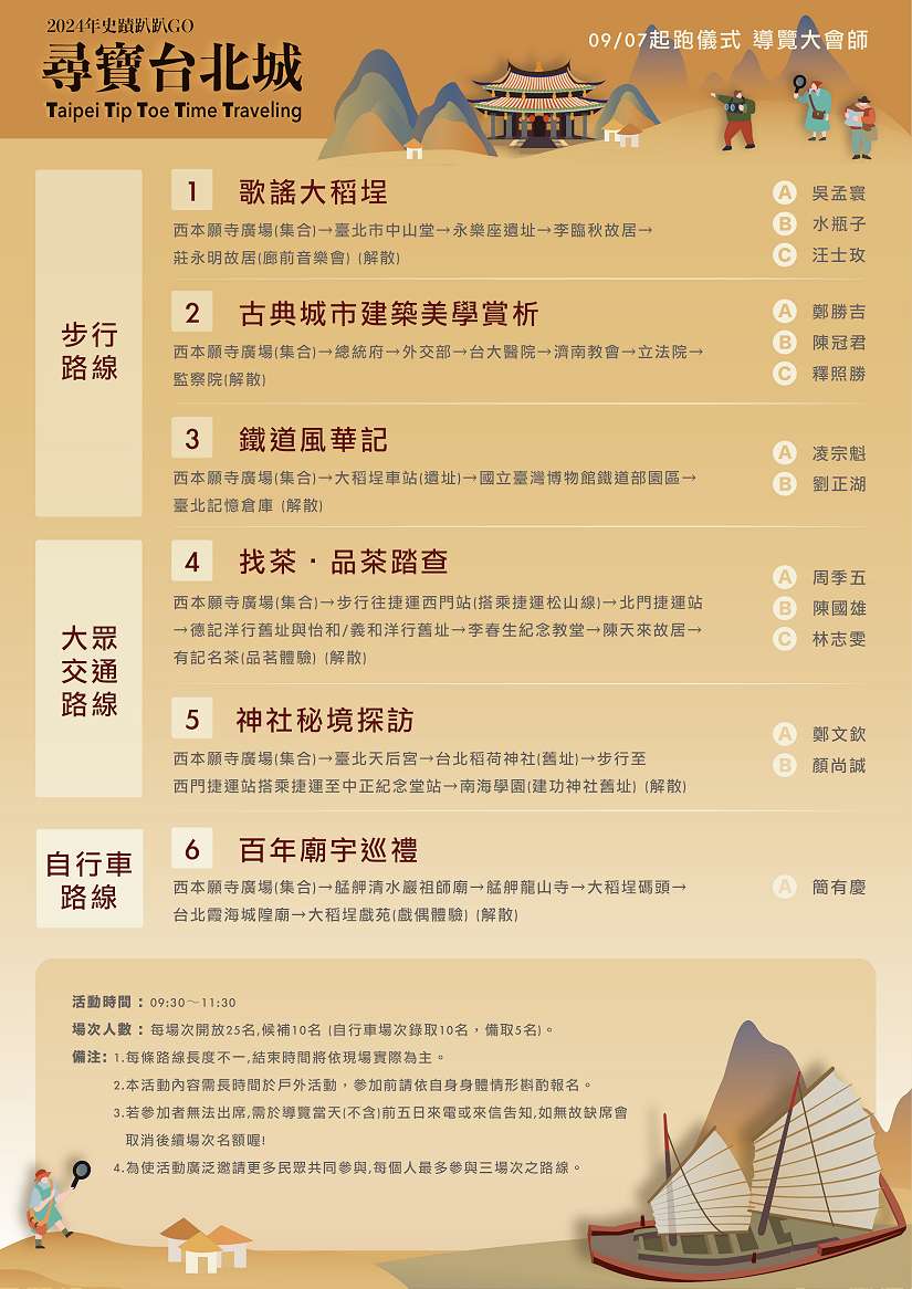 9月7日起跑儀式暨走讀導覽 以多元交通工具探索台北城-「2024年史蹟趴趴GO—尋寶台北城」起跑儀式,預計9月7日上午9時於西本願寺廣場舉行,邀請傳統月琴唸歌家鄭美、夜上海女歌手小丰、校園民歌手古勝中、偏執狂搖滾樂團等,一同「歌頌臺北城」!從臺灣民謠到搖滾金曲,不同時代的音樂元素,象徵臺北建城140週年的活力演進。當日規劃6條路線、14場次導覽走讀活動,採步行、搭乘捷運、騎自行車等方式,自西本願寺廣場出發,帶領參與民眾探尋城市內的多元史蹟文化景點,穿梭臺北的歷史時空。個別路線加入「快閃音樂歌謠欣賞」、「茶葉品茗」與「布袋戲操偶」等體驗,由職人帶領深度了解臺灣茶等更多傳統文化軼事。