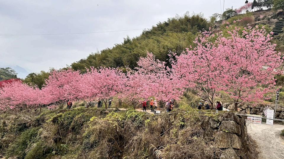 雲林縣「石壁美人谷」櫻花綻放花況已開9成且花種眾多,花況預估2月底3月初將達全開,縣府及公所聯手推出絕美賞櫻遊程、山村市集及賞花路線接駁服務等,分布約18公頃的的1萬棵櫻花,預計今年賞櫻人潮將再創新高。
