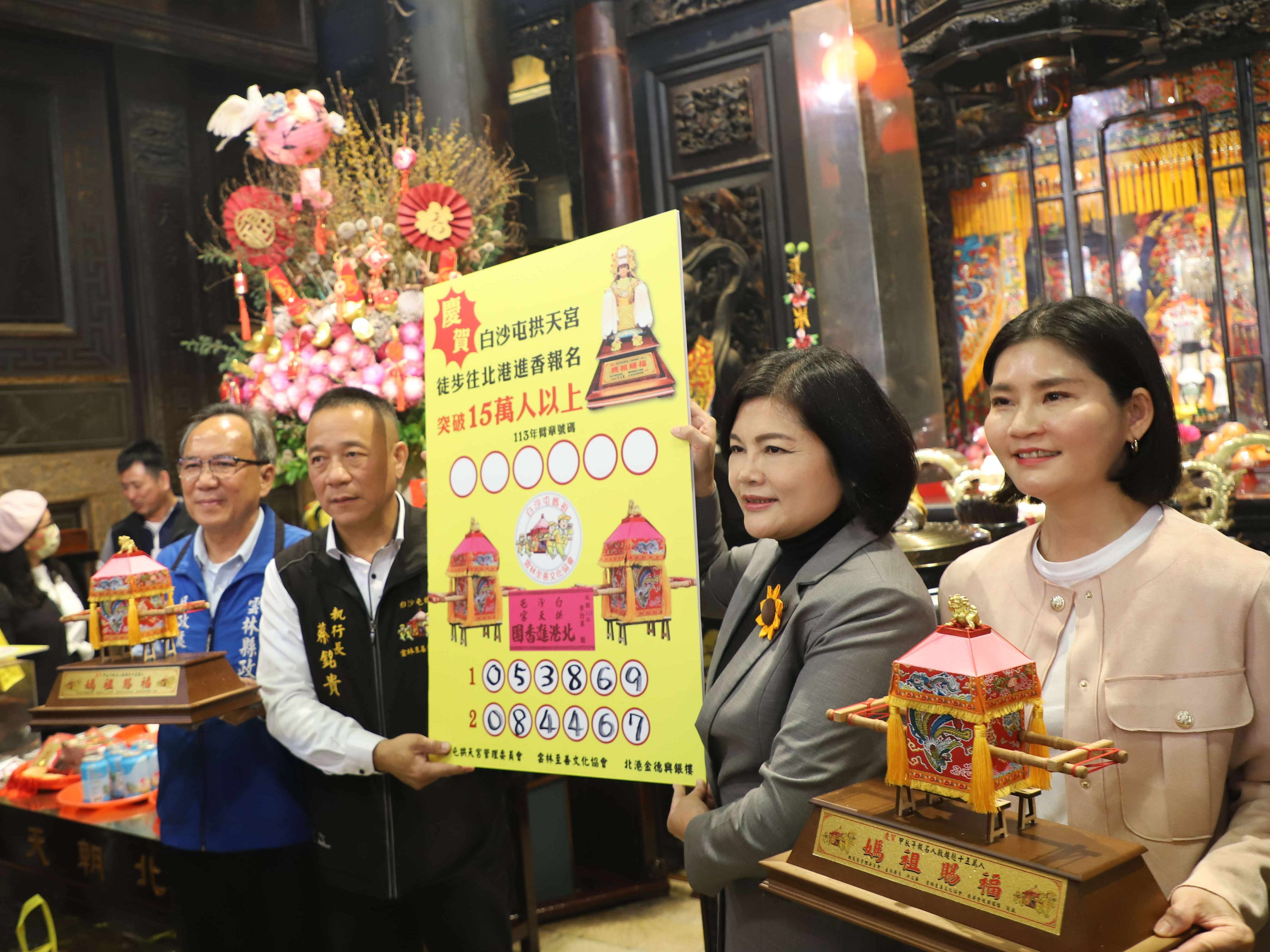 苗栗縣白沙屯媽祖、山邊媽祖北港進香,今年登記隨香信徒超過17萬人,雲林至善文化協會製作1尊交趾陶媽祖、2頂粉紅超跑迷你神轎等結緣品贈送香燈腳,11日在北港朝天宮舉行灑淨祈福儀式;這次抽出2名幸運兒獲贈粉紅超跑迷你神轎,臂章號碼分別為053869、084467,記得與雲林至善文化協會連絡,17日將再抽出1名交趾陶媽祖得主。