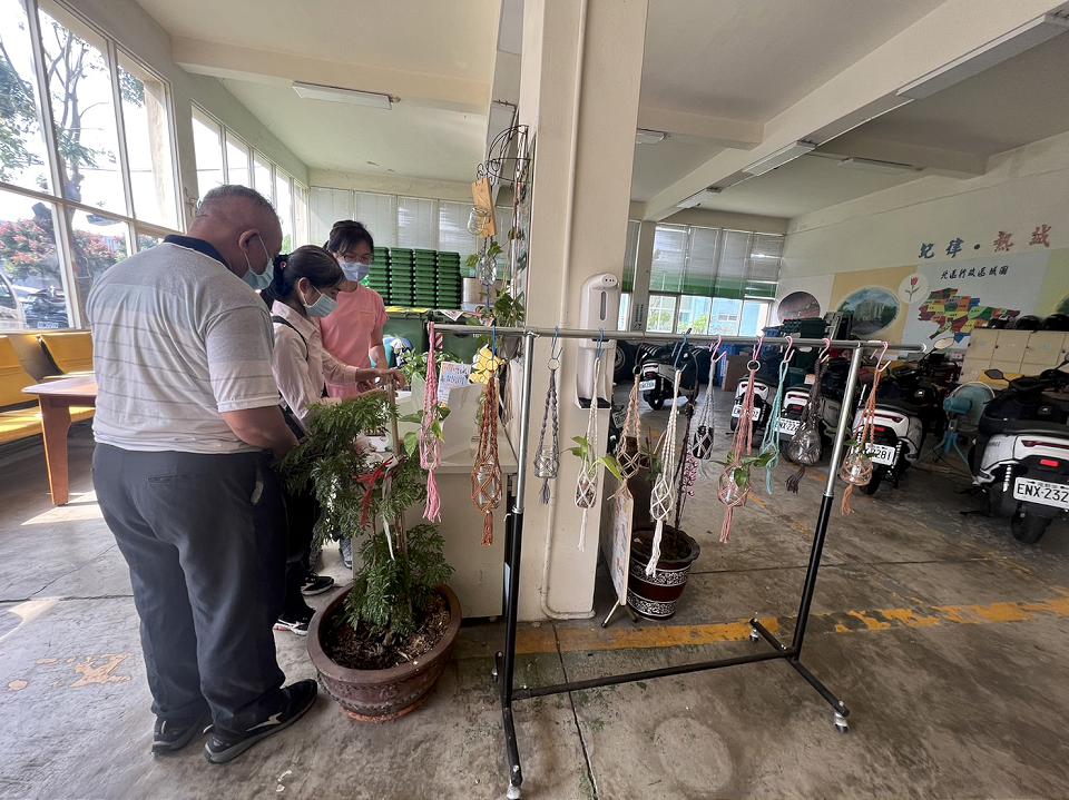北區清潔隊長張明哲表示,清潔隊每月回收廢玻璃平均量約90公噸,廢木板約15公噸,清潔隊同仁發揮創意,將玻璃瓶洗淨後,運用回收麻線或棉線編織成網袋放入玻璃瓶,變身成為綠色植物的盆栽吊籃,美觀且實用。另外,利用回收廢料的木板裁切成2片,簡單組合後變成實用手機架,讓收納更方便,未來有機會將再透過宣導活動提供民眾兌換。