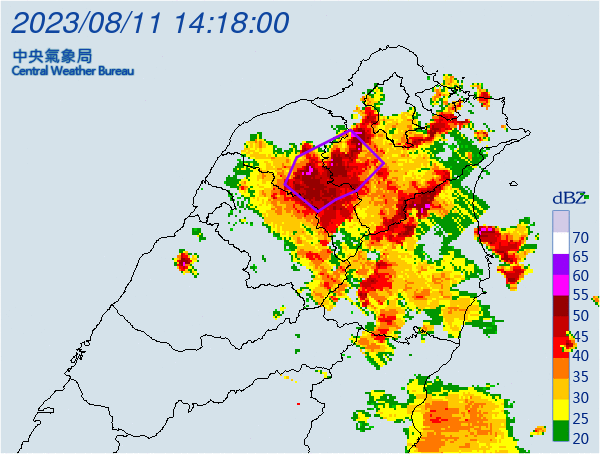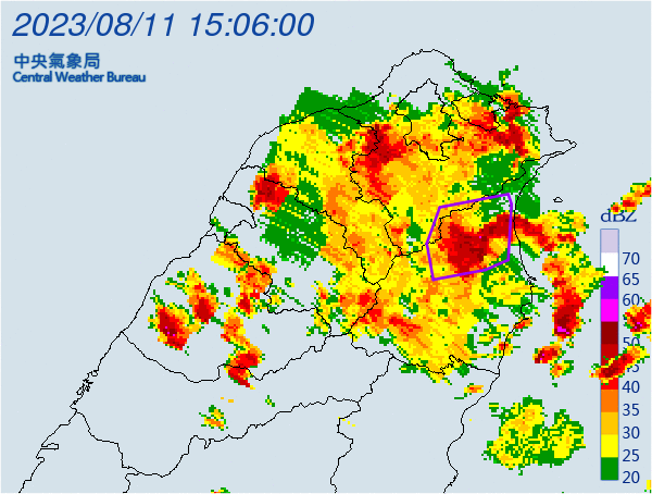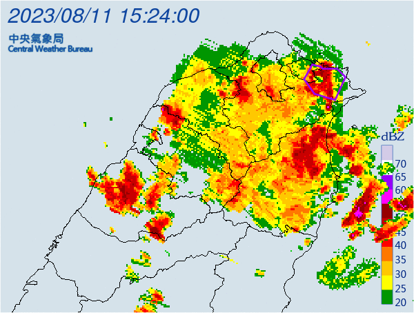 中央氣象局在11日15時13分氣象局發布雷雨編號0354大雷雨即時訊息,持續時間至16時15分;示警區域新北市烏來區。宜蘭縣宜蘭市、羅東鎮、頭城鎮、礁溪鄉、壯圍鄉、員山鄉、冬山鄉、五結鄉、三星鄉、大同鄉。
