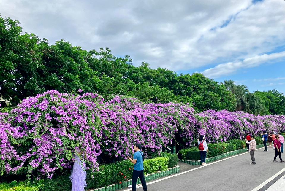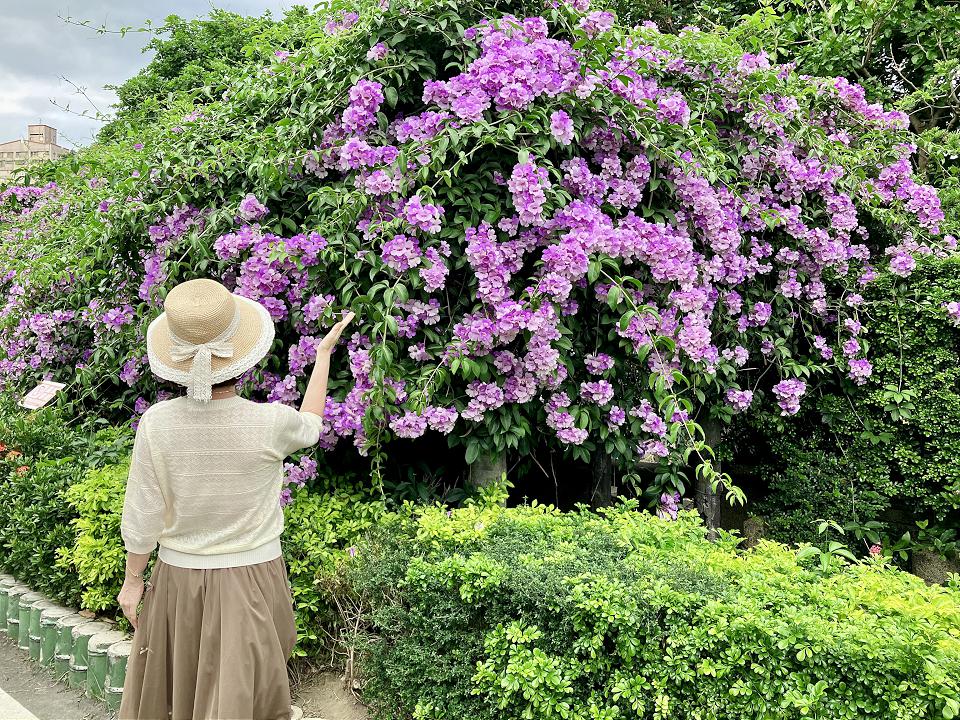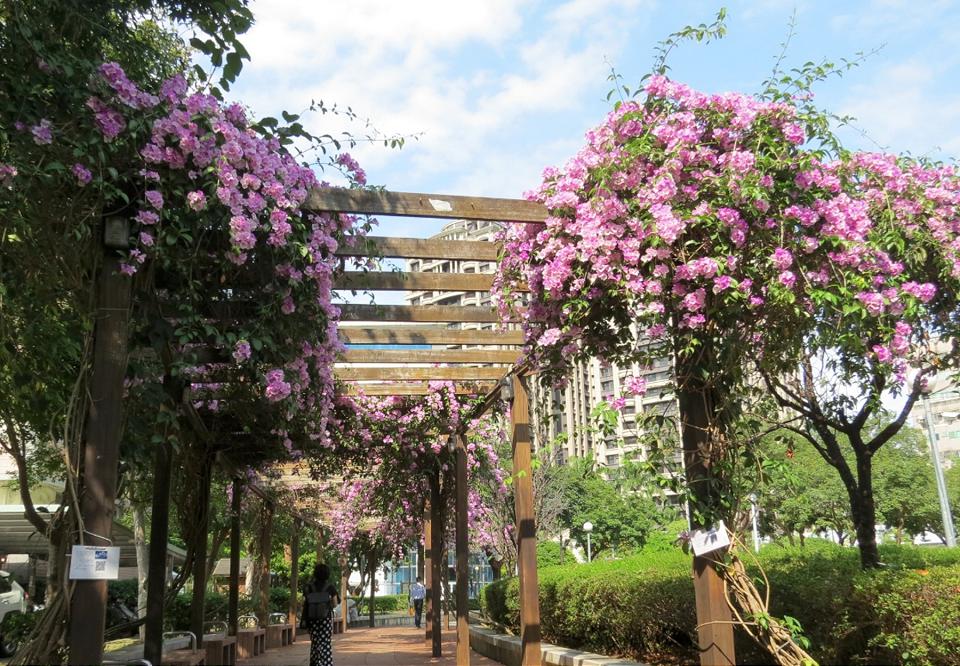 三重區的中山藝術公園,鄰近菜寮捷運站出口,公園中有藝術雕塑及歐式牌樓等,園內四季花木扶疏,是高樓林立交通繁忙的都會區中一座難得的休憩場域。當蒜香藤大爆發時,紫色的花瀑垂落,漫步廊道下感受生活中的小浪漫。