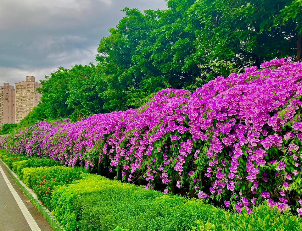 新北市綠美化環境景觀處推薦3處賞花地點,泰山區楓樹里河堤附近的蒜香藤廊道,每到花期就湧入大量遊客前來賞花,綿延約200公尺的花牆,一串串花穗垂掛枝頭上,猶如高掛綠樹上的紫色瀑布,含苞或盛開,十分迷人。除了可近拍花樹,也可登上一旁的堤防上,俯拍全景,也可以調整成微距方式,捕捉花蕊細節。