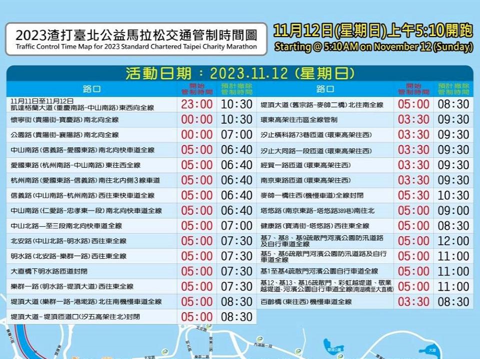 「2023渣打台北公益馬拉松」賽事,中華民國路跑協會在11月12日(日)3時至12時舉辦,這場活動將在5時10分起跑,賽事沿線行經「凱達格蘭大道、愛國東路、杭州南路、信義路、中山南北路、北安路、明水路、樂群一路、堤頂大道、麥帥二橋、環東大道、塔悠路等市區道路、高架道路,及百齡橋至南湖大橋之基隆河左、右岸河濱公園自行車道」,預估參加人數約2萬9000人。