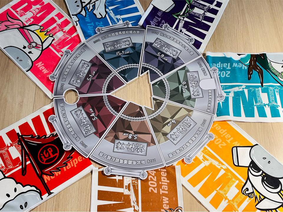 除了結合首度現身的IP毛巾外,「2024新北市鐵道馬拉松接力賽」的完賽獎牌融入了「運動觀光」理念,將賽道所在區域的觀光景點以手繪風格畫進獎牌中,像是貢寮的三貂角燈塔、卯澳漁村、靈鷲山無生道場、福隆彩虹橋、舊草嶺隧道及雙溪最具代表的不厭亭、渡船頭意象等,都成為獎牌設計的一部份;同時本屆賽事也將彩色的異材質放進獎牌中,讓獎牌跳脫傳統金、銀的單色調,當7片獎牌拼起來時,就成為色彩繽紛的一塊圓形獎牌,拍照超級吸睛!