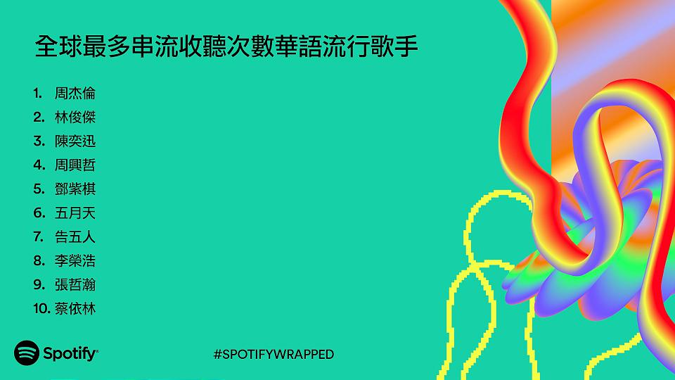 數十年來長期受到喜愛的林俊傑、陳奕迅與蔡依林持續吸引著聽眾,同樣在全球最多串流收聽次數華語歌手排行榜名列前茅,佔據第二、三、十名的位置。除了這些華語流行音樂巨星外,為聽眾帶來新鮮感的周興哲及告五人等潛力新秀也分別登上第四名與第七名的位置。