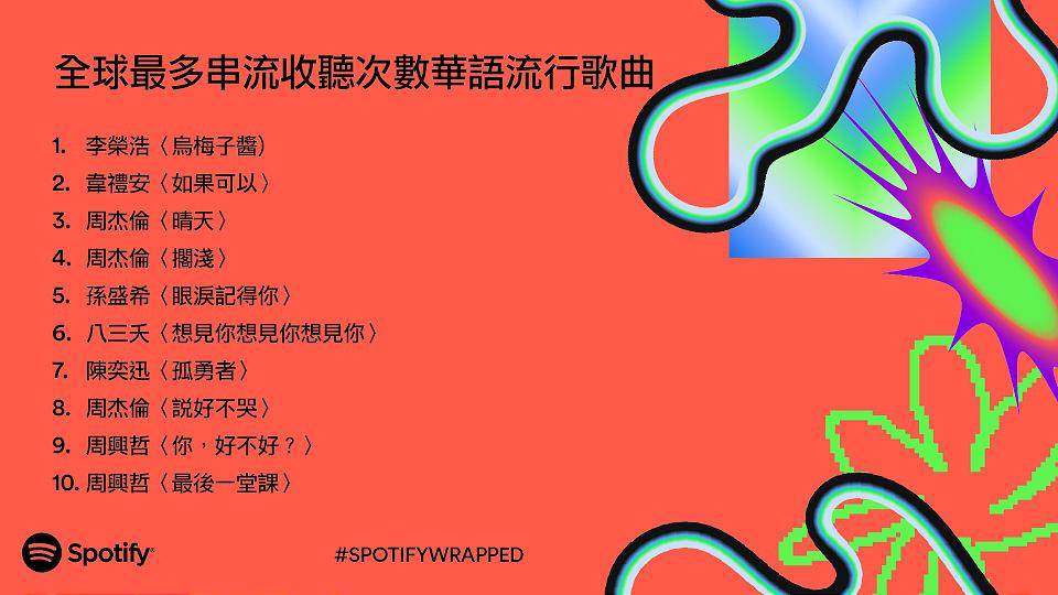 今年度全球最多串流收聽次數華語流行歌曲為李榮浩的〈烏梅子醬〉。在全球最多串流收聽次數華語流行歌曲前十名中,就有五首是熱門影劇中的歌曲,展現華語流行音樂對文化的關鍵重要性,包含第二名的韋禮安〈如果可以〉、第五名的孫盛希〈眼淚記得你〉、第六名的八三夭〈想見你想見你想見你〉,以及周興哲分別名列第九、十的〈你,好不好?〉和〈最後一堂課〉。