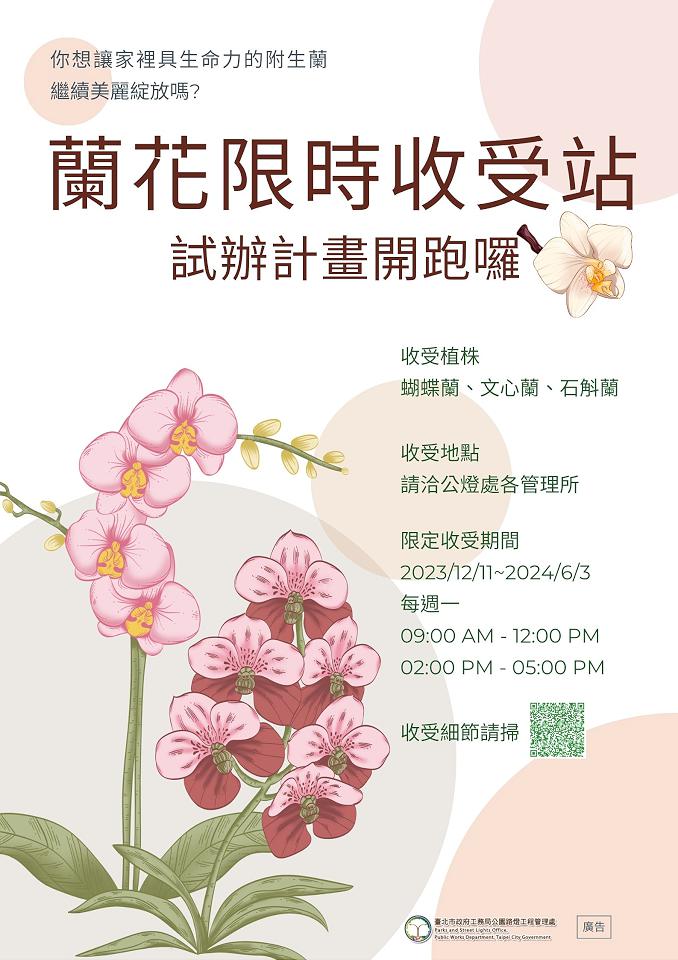 台北市公園處推出「蘭花限時收受站」試辦計畫,從112年12月11日起至113年6月3日為期半年,民眾家中倘若有無法照料的附生類蘭花,可捐贈送交公園處,由專業園藝人員養護後種植於公園內,為公園營造多樣化的賞花景緻。此試辦計畫將持續半年,歡迎市民踴躍參與,共同期待美麗的蘭花綻放於台北市的公園。