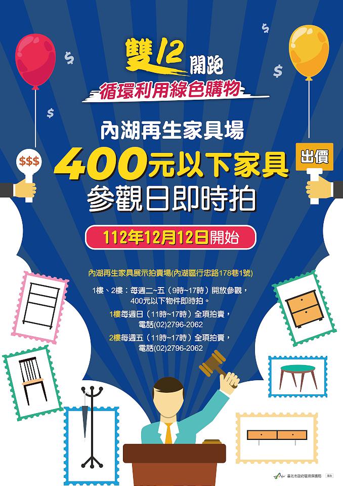 台北市環保局內湖再生家具展示場自112年12月12日起,場館內底價400元以下家具與創意小物,開放民眾於參觀日(週二至週五)便可進行即時拍賣,當場入手!現場更有多款家具銅板價起標,超有感的讓利,不僅再生家具循環無廢,也讓您聰明購物、省荷包!千萬別錯過!