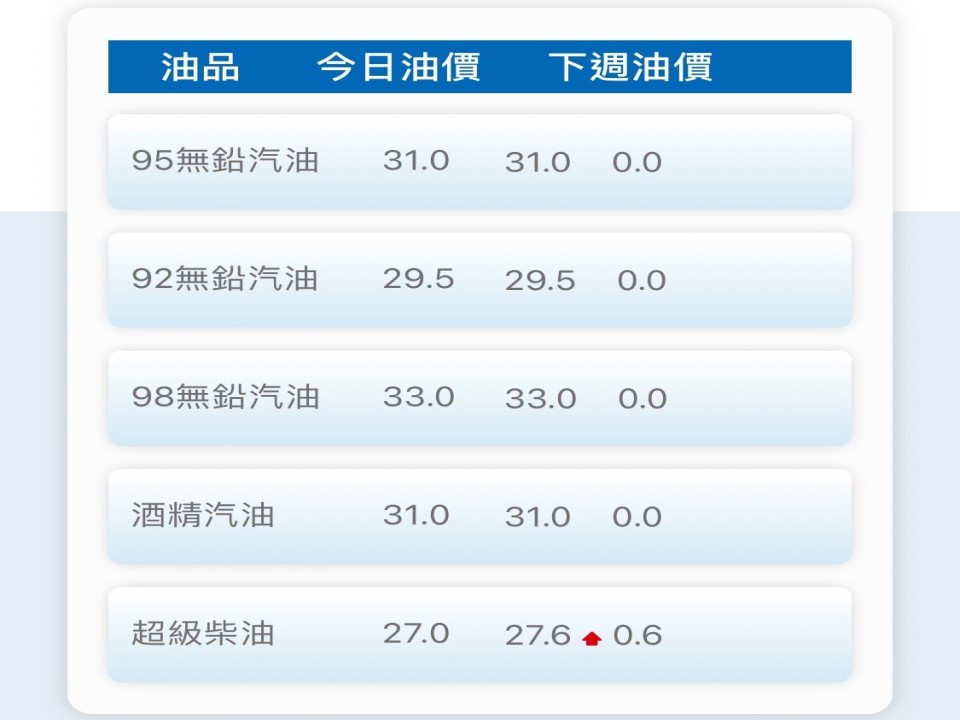 台灣中油公司明天(11日)凌晨零時起汽油價格不調整、柴油價格調漲0.6元,參考零售價格分別為92無鉛汽油每公升29.5元、95無鉛汽油每公升31.0元、98無鉛汽油每公升33.0元、超級柴油每公升27.6元。本週因雙重平穩機制啟動,汽、柴油各吸收0.3元及0.9元。