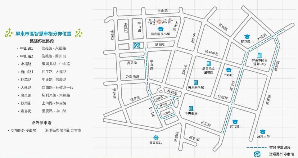 屏東市區共規劃345格路邊智慧車格。翻攝屏東縣政府