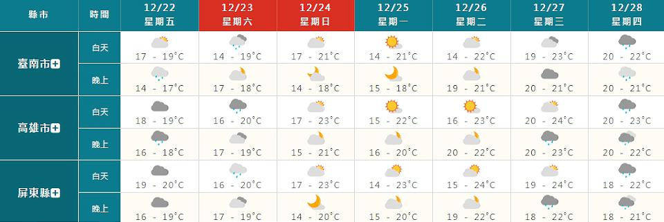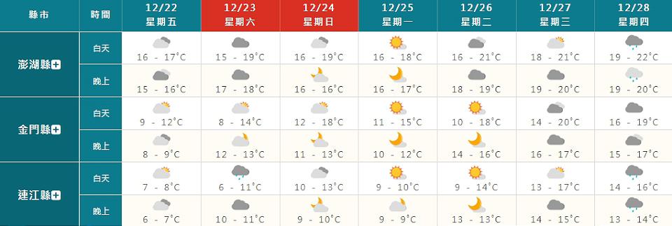 22日(五)受到寒流影響,中部以北、東北部及東部天氣非常寒冷,低溫橙色燈號地區有新北市、基隆市、台北市、桃園市、新竹縣、宜蘭縣、金門縣有持續10度左右氣溫發生的機率,連江縣有持續6度左右氣溫發生的機率。東北部、東南部地區、恆春半島及桃園以北山區有局部短暫雨,大臺北、東部地區及中南部山區亦有零星短暫雨,其他地區為多雲。
