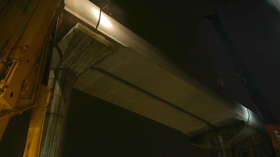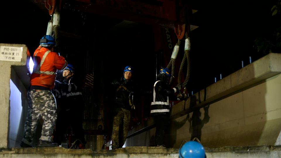 預鑄U行梁吊掛施工人員作業。翻攝新北市政府