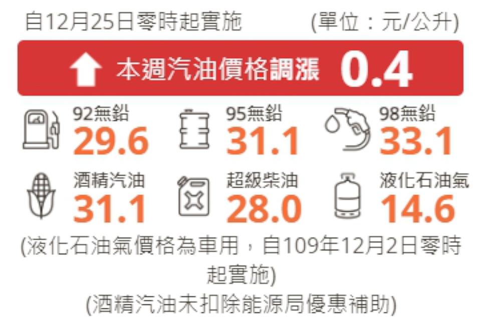 台灣中油公司自25日凌晨零時起汽油調漲0.4元、、柴油調漲0.1元,參考零售價格分別為92無鉛汽油每公升29.6元、95無鉛汽油每公升31.1元、98無鉛汽油每公升33.1元、超級柴油每公升28.0元。