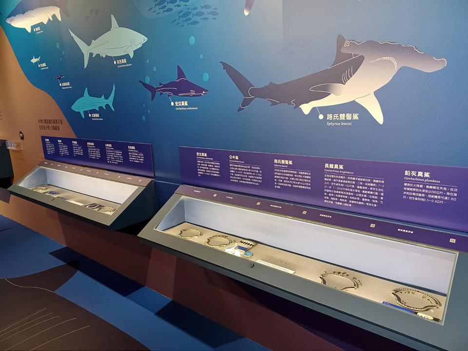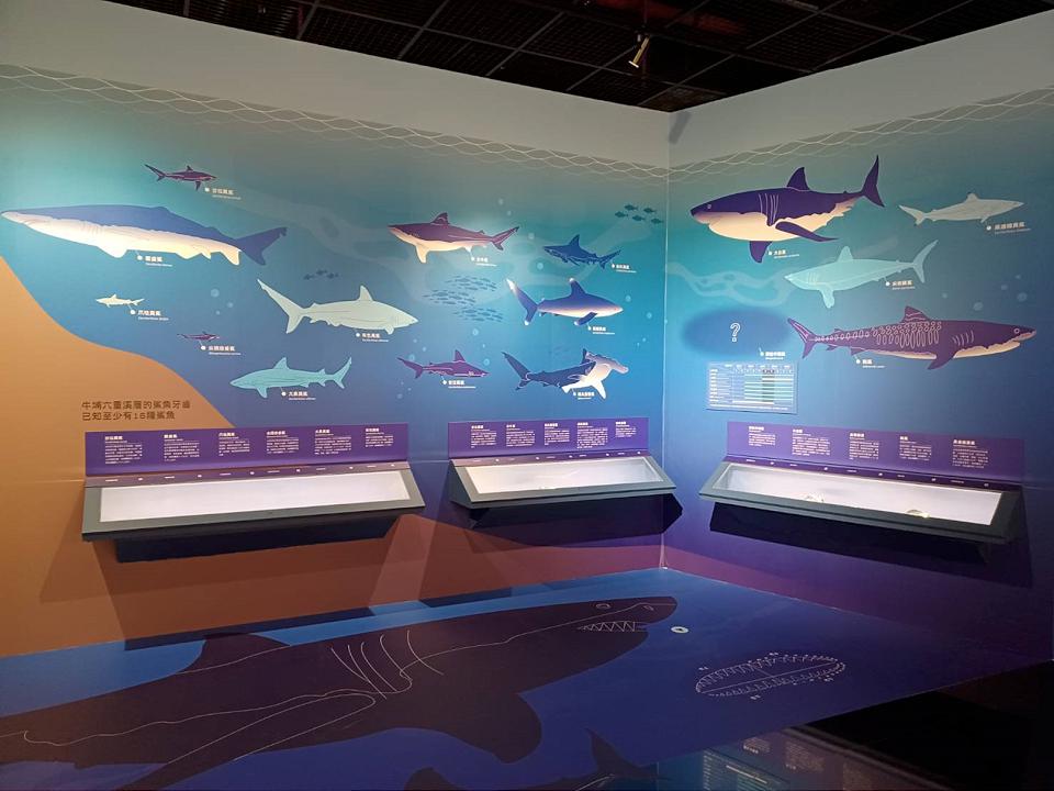 嘉博館典藏超過300顆的鯊魚牙齒化石,其中大多數都是來自嘉義市民薛文吉先生於1970年代在嘉義牛埔地區採集及捐贈。本次展示更新內容則是依據中央研究院生物多樣性研究中心海洋古生物實驗室研究團隊針對嘉博館典藏之鯊魚牙齒化石進行研究,逐一鑑定這些大小不一、形狀差異的鯊魚牙齒化石,並辨認出這批鯊魚牙齒化石至少源自16種鯊魚,包括較為大眾所熟知的大白鯊、公牛鯊等。因此,現場特別展出這16種鯊魚的牙齒,並詳細描述各種鯊魚牙齒的特徵,加上鯊魚的生態介紹,讓觀眾可透過鯊魚牙齒化石,連結產生對鯊魚生態與海洋環境保護的意識。