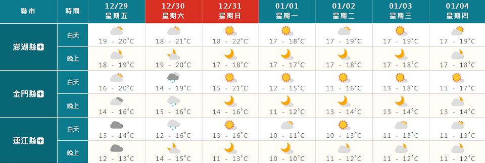 中央氣象署預報31日受到東北季風影響,因為強度可能接近大陸冷氣團等級,所以北部、東北部跨年夜到元旦清晨將再冷一波,低溫為14、15度左右,其他地區也只有16、18度,提醒參加跨年活動或迎接曙光等戶外活動,請做好保暖的措施;直到2日白天東北季風減弱氣溫才會稍微回溫,但3日東北季風再增強,氣溫會再次下降。