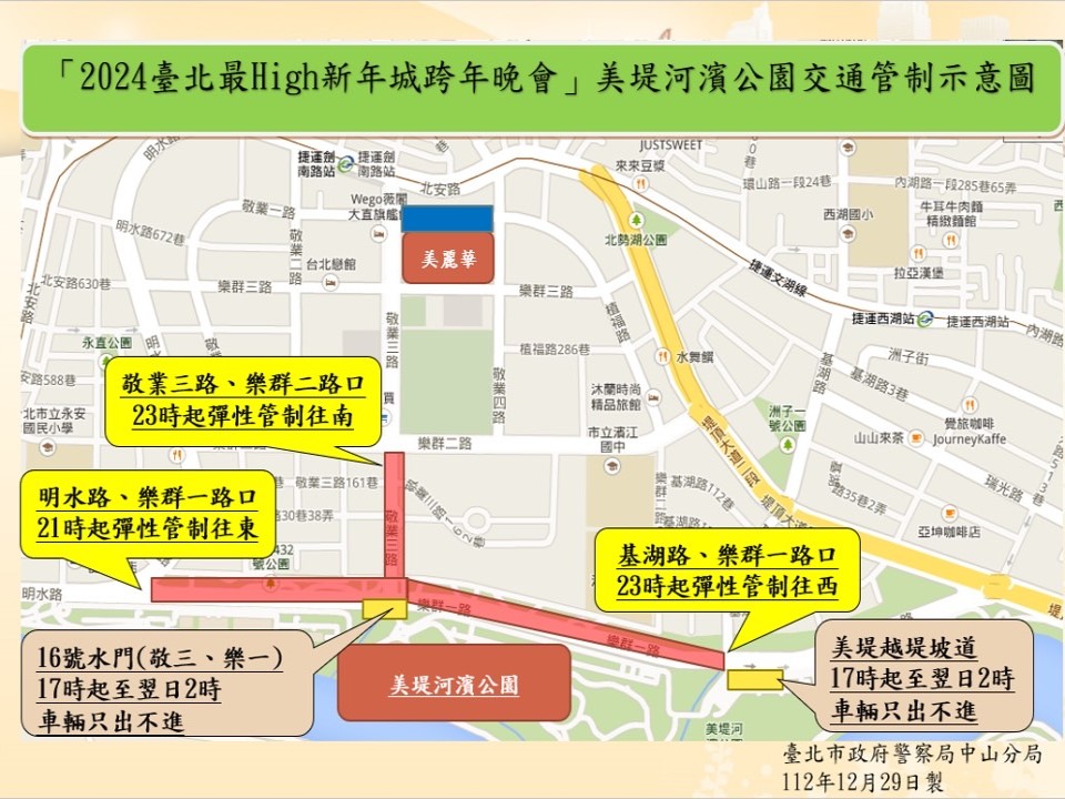 台北市政府市民廣場31日跨年晚會,加上台北101跨年煙火施放,美堤河濱公園往年都會湧入大批人潮,台北市中山警分局為了避免交通壅塞,將進行區域性交通管制,同時呼籲民眾搭乘大眾運輸工具前往,散場時更不要歡樂之餘酒後駕車。
