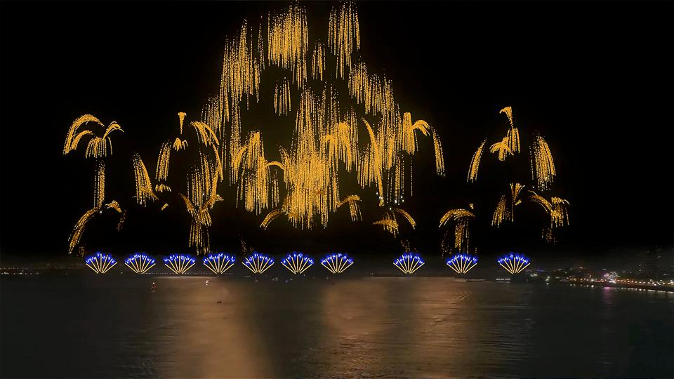 第五章節「黃金瀑布、奪目奇景」,金黃色閃柳瀑布煙火彈在空中緩緩垂落而下,帶來有如新北瑞芳黃金瀑布奪目的奇景畫面(示意圖)。翻攝新北市政府