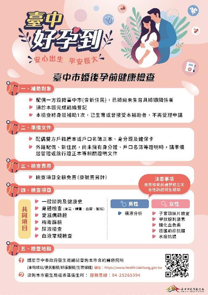台中市政府重視及支持生育健康,自1月1日起加碼補助「婚後孕前健康檢查」,補助對象為配偶一方設籍台中市且已婚尚未生育者,符合資格夫妻可攜帶戶口名簿、雙方身分證及健保卡,至衛生局合約35家醫療機構接受健康檢查,鼓勵新婚夫妻計畫孕育寶寶前,先瞭解雙方身體狀況,為孕育健康的下一代做好規劃。