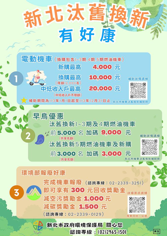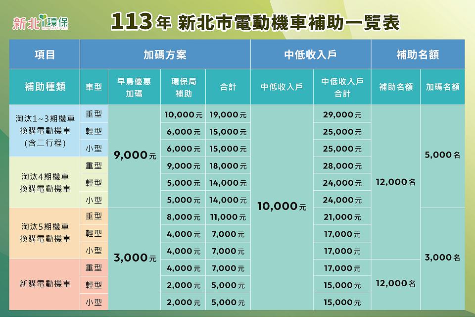 新北市為達成淨零碳目標,持續推行運具電動化,環保局公告113年電動機車補助方案,除持續補助新購及淘汰1~5期燃油機車換購電動機車最高各4000元及1萬元外,早鳥加碼補助方案特別針對1~4期換購電動機車補助前5000名申請通過者,再加碼補助9000元較112年多1000元;5期換購電動機車補助及新購電動機車補助方案前3000名申請通過者,再加碼補助3000元。