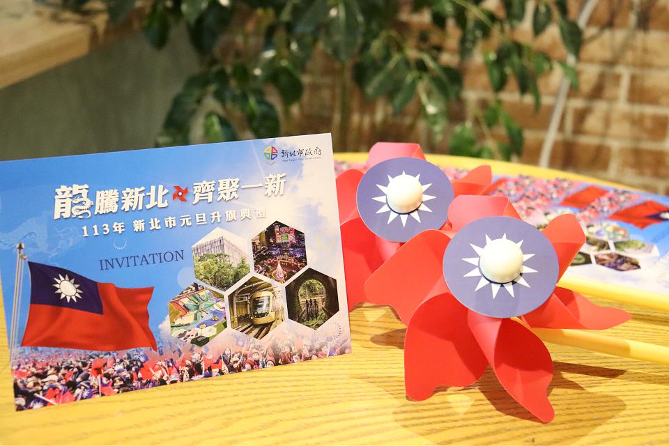 新北市政府113年元旦升旗典禮活動將於早上7點半在新北市民廣場舉辦,主題「龍騰新北 齊聚一新」,邀請萬人齊聚,團結迎接嶄新的一年,並特別設計國旗風車,帶給大家新年好兆頭。現場於早上7點開始發送限量2024份國旗風車及紀念版明信片給參與民眾,用滿滿國旗元素意象,象徵在新的一年和中華民國一起打拼以及愛國的心意。