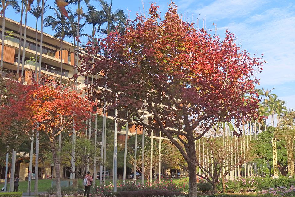 台北市民難得在市區裡看到楓葉綠轉紅。翻攝台北市政府