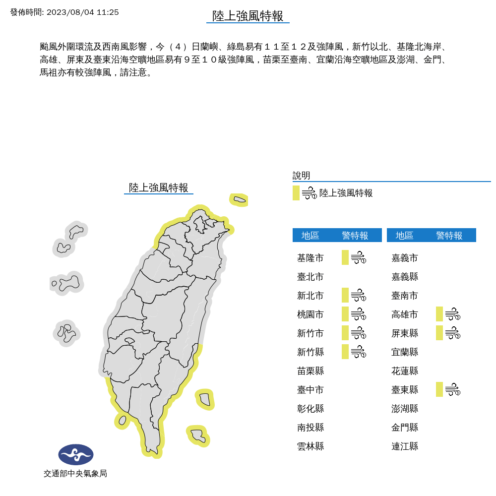 受到颱風外圍環流影響,4日強風特報風地區有蘭嶼、綠島及基隆北海岸易有10至11級強陣風,新竹以北、高雄、屏東及臺東沿海空曠地區易有9至10級強陣風,苗栗至臺南、宜蘭沿海空曠地區及澎湖、金門、馬祖亦有較強陣風。(記者余珩維/台北報導)
