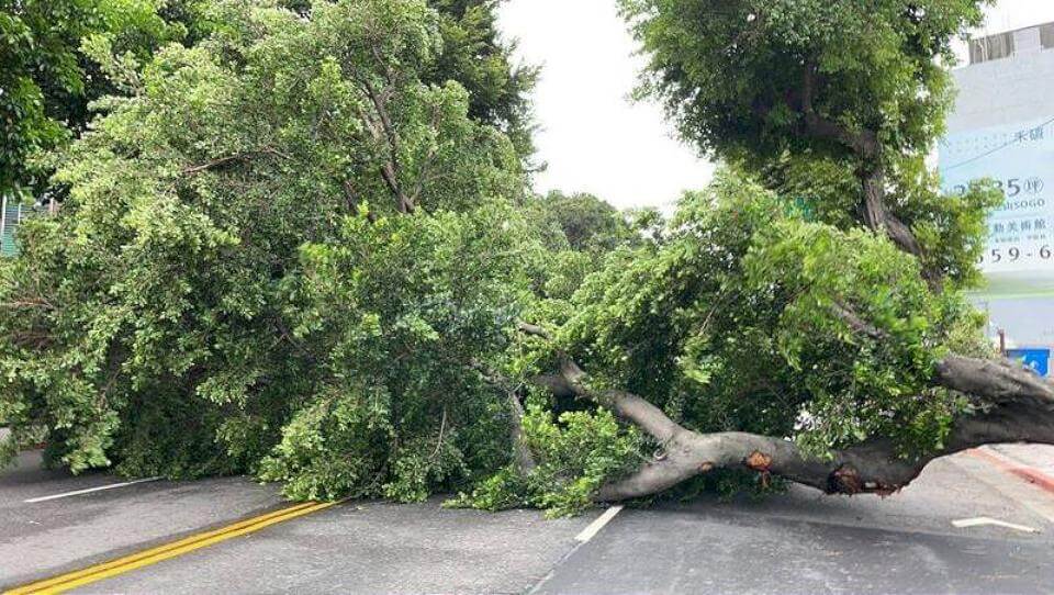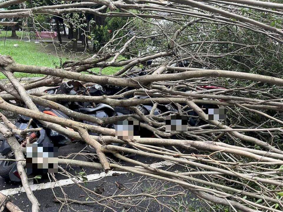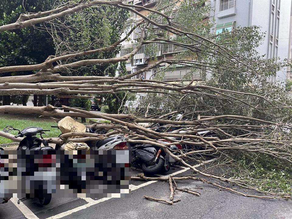新北市3日7時許,新店區中正路307巷內發生路樹倒塌,1棵高約10公尺的路樹,疑似不敵強勁風勢直接應聲到下,當場壓到停放一旁的8部機車,所幸當時沒有居民路過,已通知新店區災防中心處理。