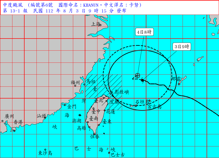 中央氣象局表示,中度颱風卡努3日9時中心位置在北緯26.5度,東經124.7度,在台北東北東方約360公里海面上,以每小時5轉9公里速度,向西轉東北進行。暴風圈半徑約為280公里,正逐漸進入台灣北部近海及東北部近海,對新北、台北、基隆及宜蘭構成威脅,預計入夜後風雨逐漸變大。