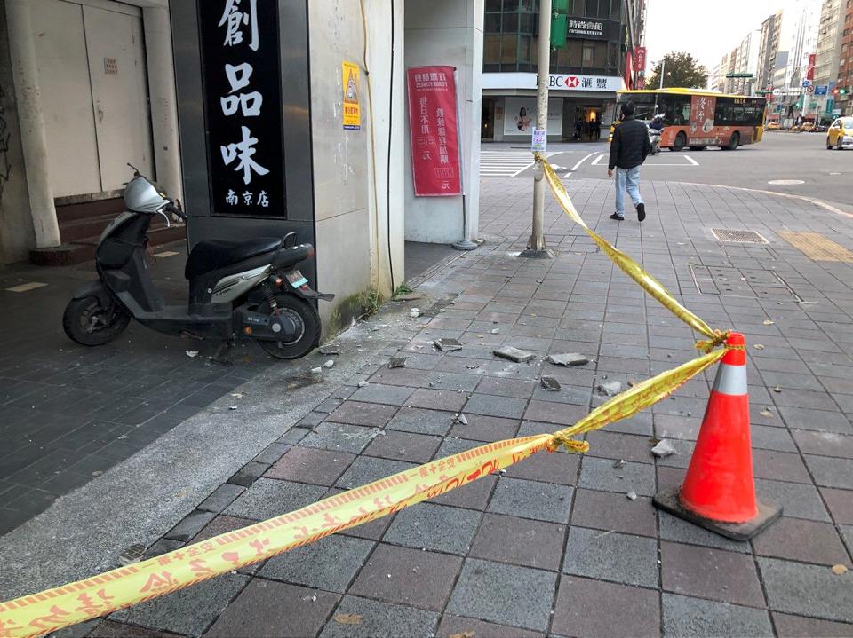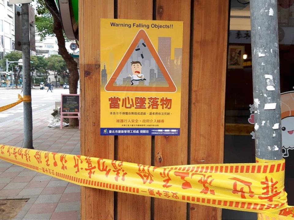 若發生外牆磁磚剝落,必須豎立警告避免人車靠近。翻攝台北市政府