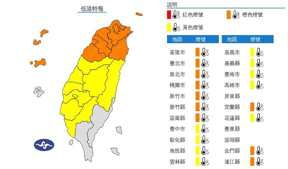 中央氣象署發布低溫特報