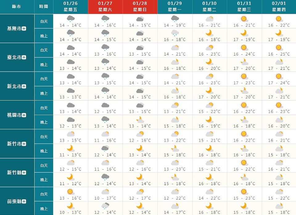 27日(六)、28日(日)寒流逐漸減弱,北部及東北部天氣仍寒冷,其他地區早晚亦寒冷,中南部日夜溫差大;環境仍為偏東北風,迎風面台灣北部、東半部地區、中南部山區及金門有局部短暫雨,其他地區及澎湖、馬祖為多雲到晴。桃園至雲林沿海空曠地區及恆春半島、蘭嶼、綠島、澎湖易有較強陣風,請注意。