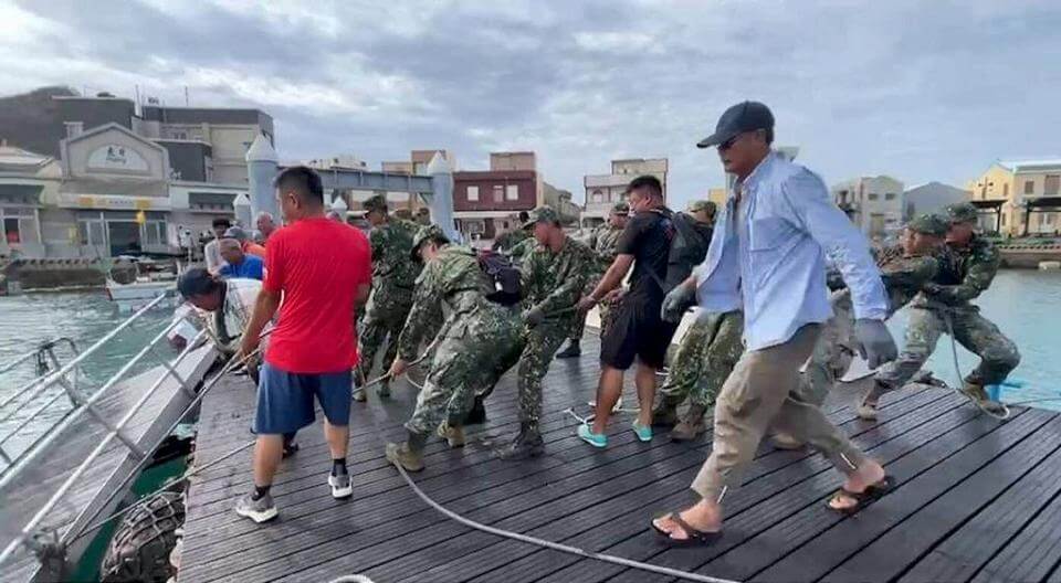 杜蘇芮颱風重創澎湖,軍方投入大批兵力,拉起沉海的移動式棧橋。畫面澎湖防衛指揮部提供
