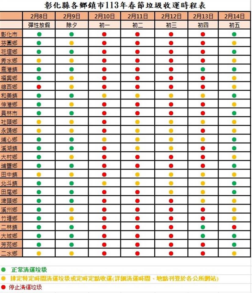 2月13日(初四)排定特定時間清運之公所如下,和美鎮、社頭鄉、埔心鄉、田中鎮、北斗鎮、埤頭鄉;另鹿港鎮、二林鎮及大城鄉提前恢復清運外,其餘停止清運。