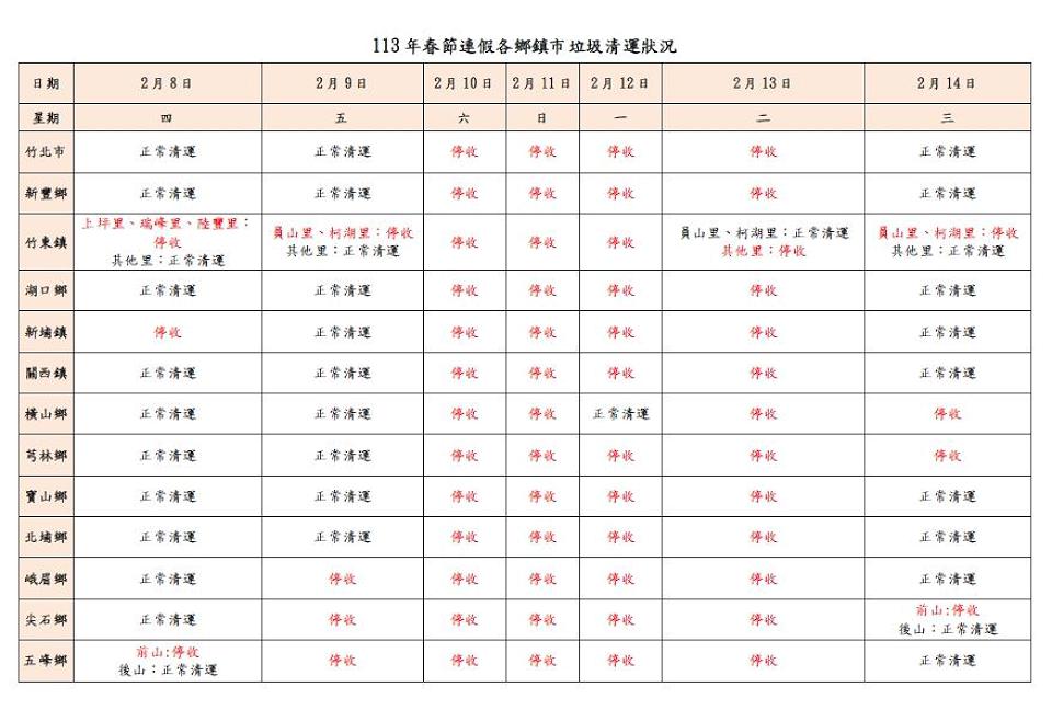 縣府環保局表示,2月8日除新埔鎮與竹東鎮上坪里、瑞峰里、陸豐里等3里,以及五峰鄉前山地區停收以外,其他鄉鎮市皆維持清運。2月9日(除夕)當天除峨眉鄉、五峰鄉、尖石鄉與竹東鎮員山里、柯湖里停收以外,其他鄉鎮市皆維持清運。