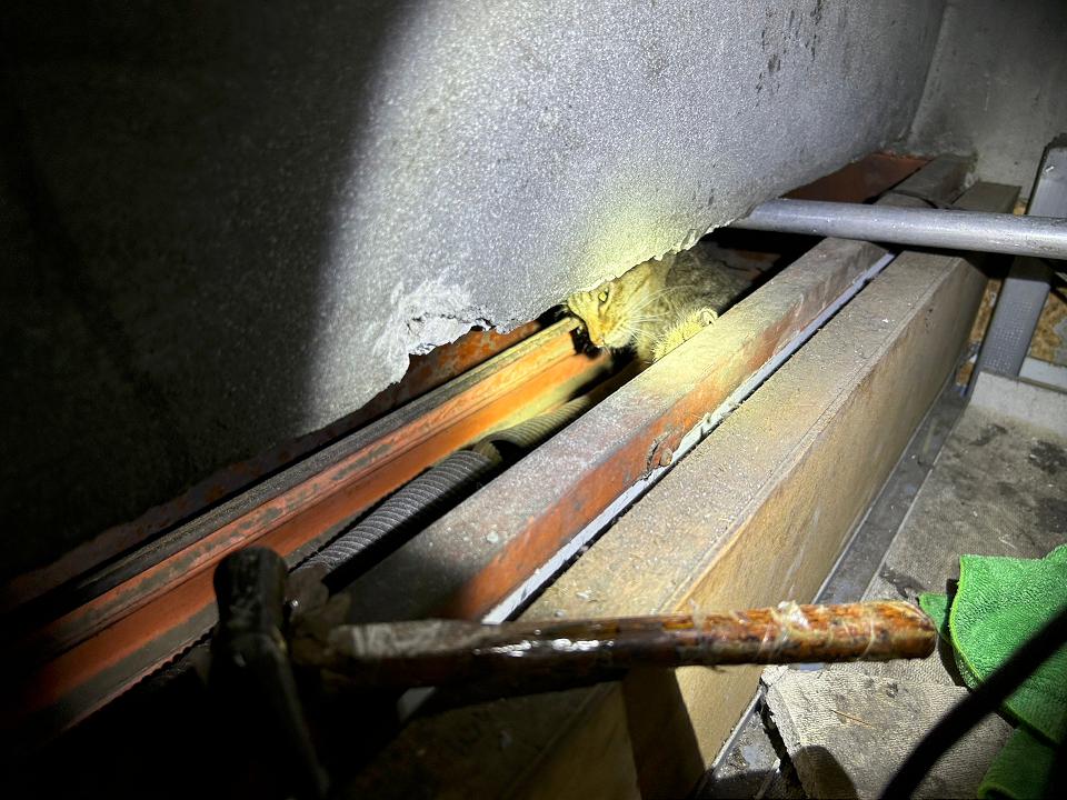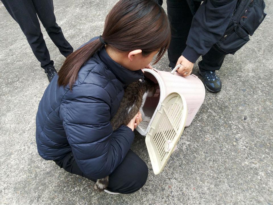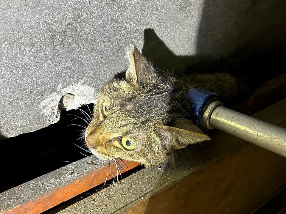 新北市動保處日前接獲板橋區文化路市場附近愛媽求救,指稱市場有貓受困在銀行後面的牆壁內側數日,動保員現場與銀行交涉後經許可入內檢查,發現橋壁內側厚實隙縫狹窄,無法利用人力或相關協套輔具可深入救貓,打破牆壁唯一可行方式,由於涉及破壞牆面結構恐有保安問題,經銀行分行人員緊急聯繫總行授權,在銀行保全人員協助下,動保員終於救出多日受困貓咪。