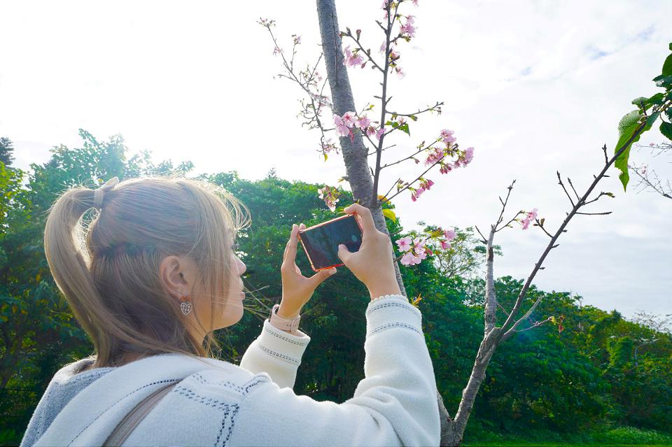新北市政府高灘地工程管理處張修銘處長表示,陽光運動公園為新店溪流域重要特色河濱公園,園區內的河津櫻今年受到暖冬影響,河津櫻目前已逐漸綻放,預計賞櫻期於2月上旬至3月上旬,花朵沿著陽光運動公園步道粉嫩綻放,和綠地及藍天相互呼應,展現春日限定的夢幻風景。