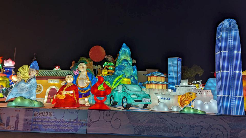其中來自杭州市的"秀麗三江"燈組,以三江兩岸為核心理念設計,由新安江,富春江,錢塘江貫穿涵蓋三江兩岸各自的特色建築和歷史名人來進行點綴,讓遊客瞭解到所謂三江兩岸的流域景區和秀麗風光。