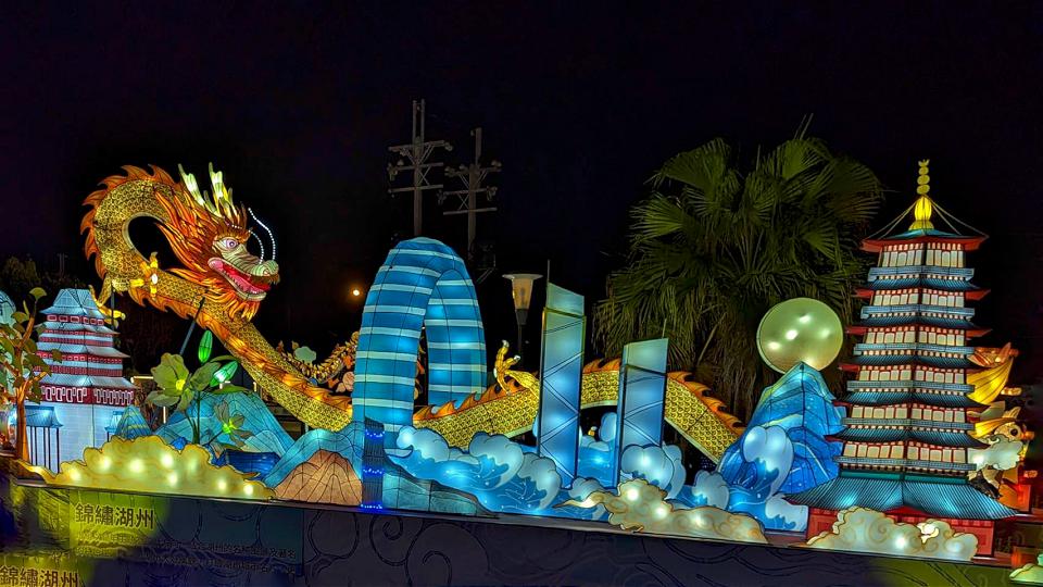 湖州的"錦繡湖州"湖州市燈組以龍年主題為設計方向,結合湖州的名勝風景及著名的特色建築,突出湖州大好風貌,打造湖州城市名片,更寓意新春吉祥,福滿天下。(記者黃子瑋/南投報導)