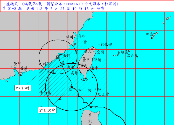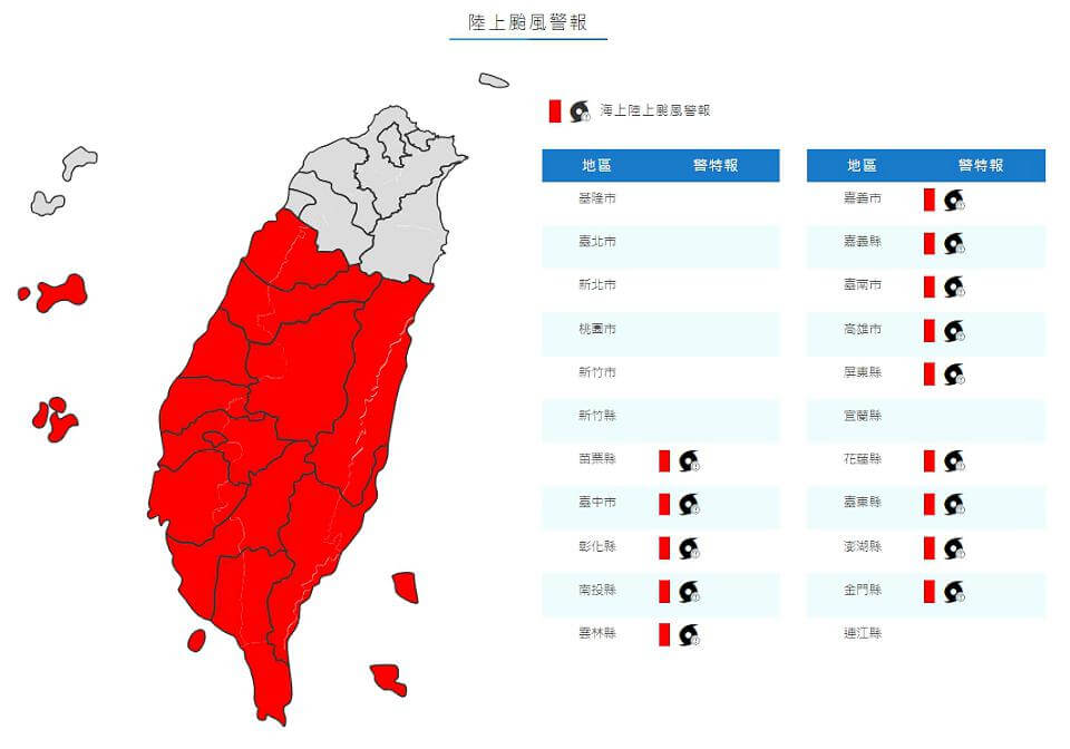 陸上警戒區域苗栗、臺中、彰化、南投、雲林、嘉義、臺南、高雄、屏東、恆春半島、花蓮、臺東、澎湖、金門應嚴加戒備。海上警戒方面台灣附近各海面、巴士海峽及東沙島海面航行及作業船隻應嚴加戒備。