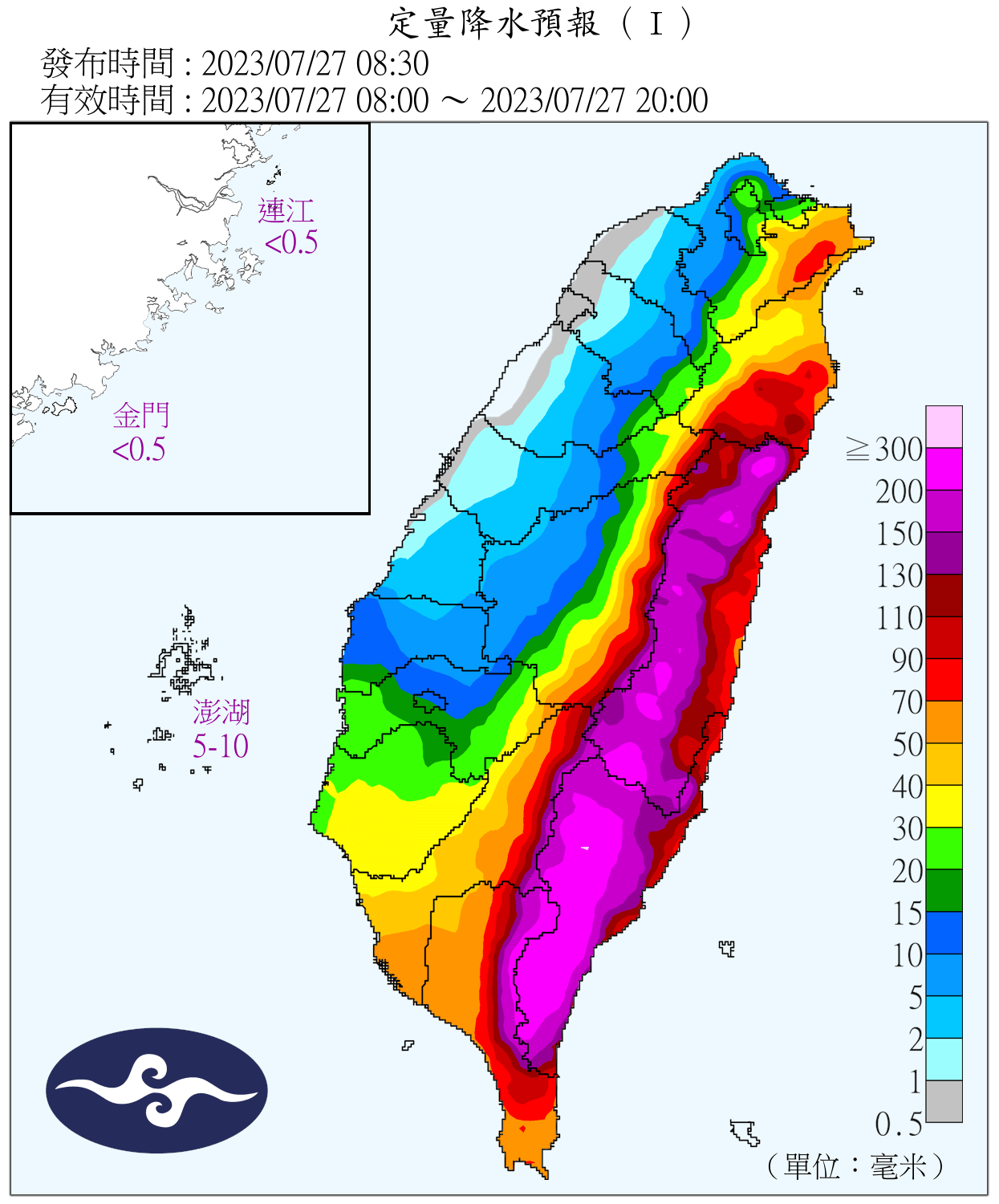 累積雨量方面,花蓮縣富里760.5毫米,台東縣利嘉林道639.5毫米,屏東縣大漢山590.5毫米,宜蘭縣翠峰湖414毫米,高雄市排雲282.5毫米,南投縣小奇萊277.5毫米,台中市南湖圈谷268毫米,新北市福山242.5毫米。(記者余珩維/台北報導)