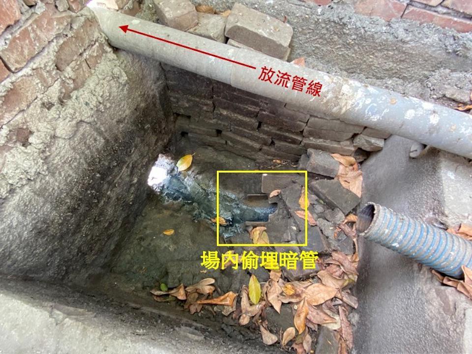 環保局表示,現場養豬場放流口未發現廢水排出,卻在放流口下方暗溝發現大量畜牧廢水排出,這暗溝為業者場內偷埋暗管排放口,正排放未妥善收集處理養豬廢水至場外水溝,稽查人員立即採樣,除依水污法第18-1條繞流排放規定,依法告發外,並命立即停止排放,限期封管。