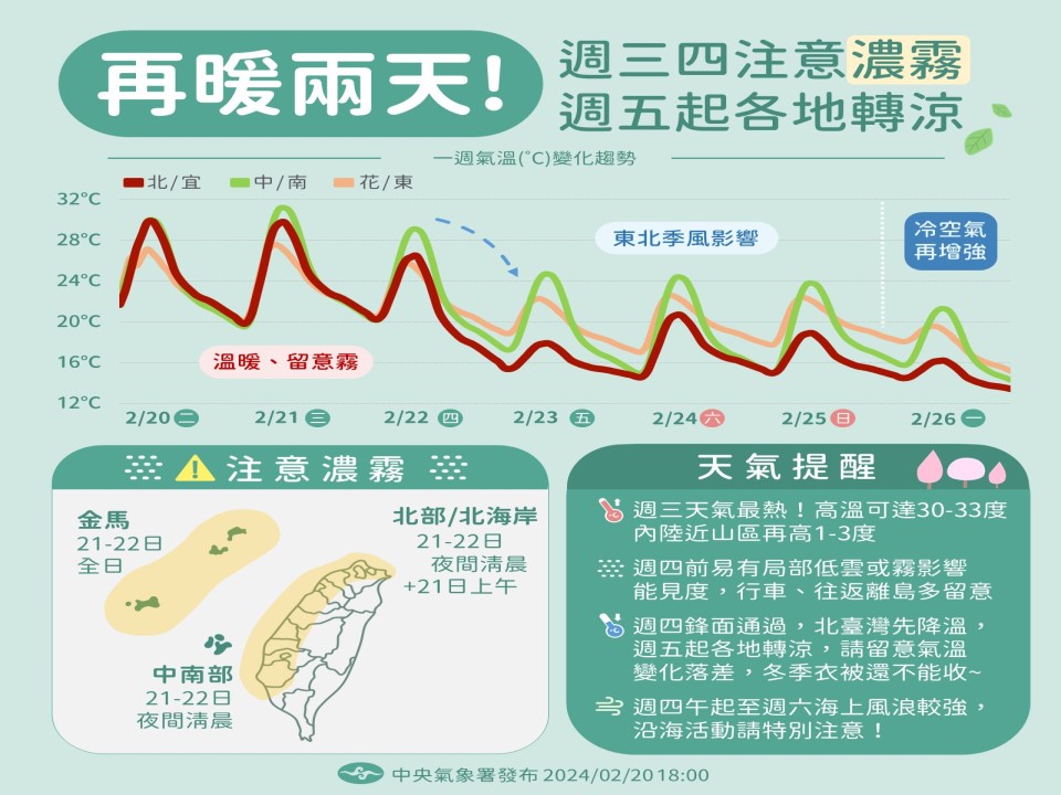 週四(22日)鋒面通過及東北季風增強,白天仍然溫暖舒適,不過隨著鋒面影響及東北季風報到,中午過後北台灣氣溫就有機會稍下降,下半天天氣逐漸轉涼,天氣方面,水氣增多,北部、東半部地區及恆春半島有局部短暫陣雨,中南部山區也有零星短暫陣雨,其他地區為多雲到晴。馬祖、金門及夜晚至清晨北部地區易有局部霧或低雲影響能見度,請注意。