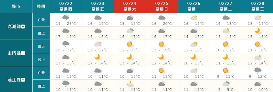 週五(23日)到週日(25日)受到東北季風影響,北部、宜蘭、花蓮高溫約降至18至22度,中南部、台東白天雖仍溫暖舒適,但各地夜間低溫將降至約14至16度之間,天氣方面,迎風面的基隆北海岸、東半部地區及恆春半島有局部短暫雨,桃園以北地區亦有零星短暫雨,其他地區為多雲到晴,此外,這段時間雲林以北沿海空曠地區及各離島風力較強,請注意。(記者余珩維/台北報導)