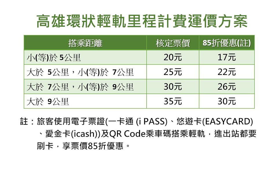 高雄市政府輕軌暖心便民搭乘措施亦持續實施,凡持本市博愛卡(身障人士)、敬老卡身分的民眾,進出站仍要刷卡,且即可免費搭乘高雄輕軌,歡迎多加利用。捷運局再次提醒,民眾搭乘輕軌進出站務必都要刷卡,若無完整進出站刷卡紀錄將會鎖卡..........