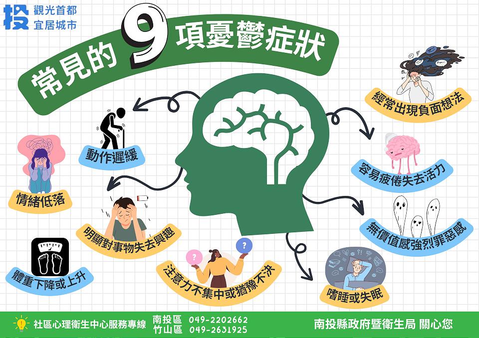 老年憂鬱症並不可怕,盡早發現、儘早接受治療,可大幅改善生活品質並防止自殺的發生,為提升民眾對心理健康促進之重視與精神醫療資源可近性,更於南投市、埔里鎮、竹山鎮、水里鄉、信義鄉等衛生所設立精神醫療巡迴服務定點門診,讓有需要的民眾可就近就醫,另轄內13鄉鎮市衛生所及2處社區心理衛生中心亦提供免費心理諮商服務,倘民眾發現自己或身邊親友有心理困擾時,可在第一時間諮詢或協助安排就醫。(記者劉逸撰/南投報導)